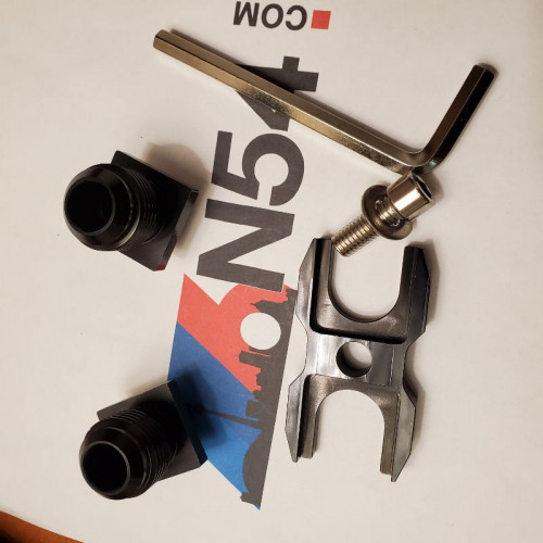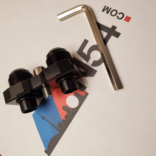 Uses two -10AN adaptors and a locking plate. Works great. No leaks.